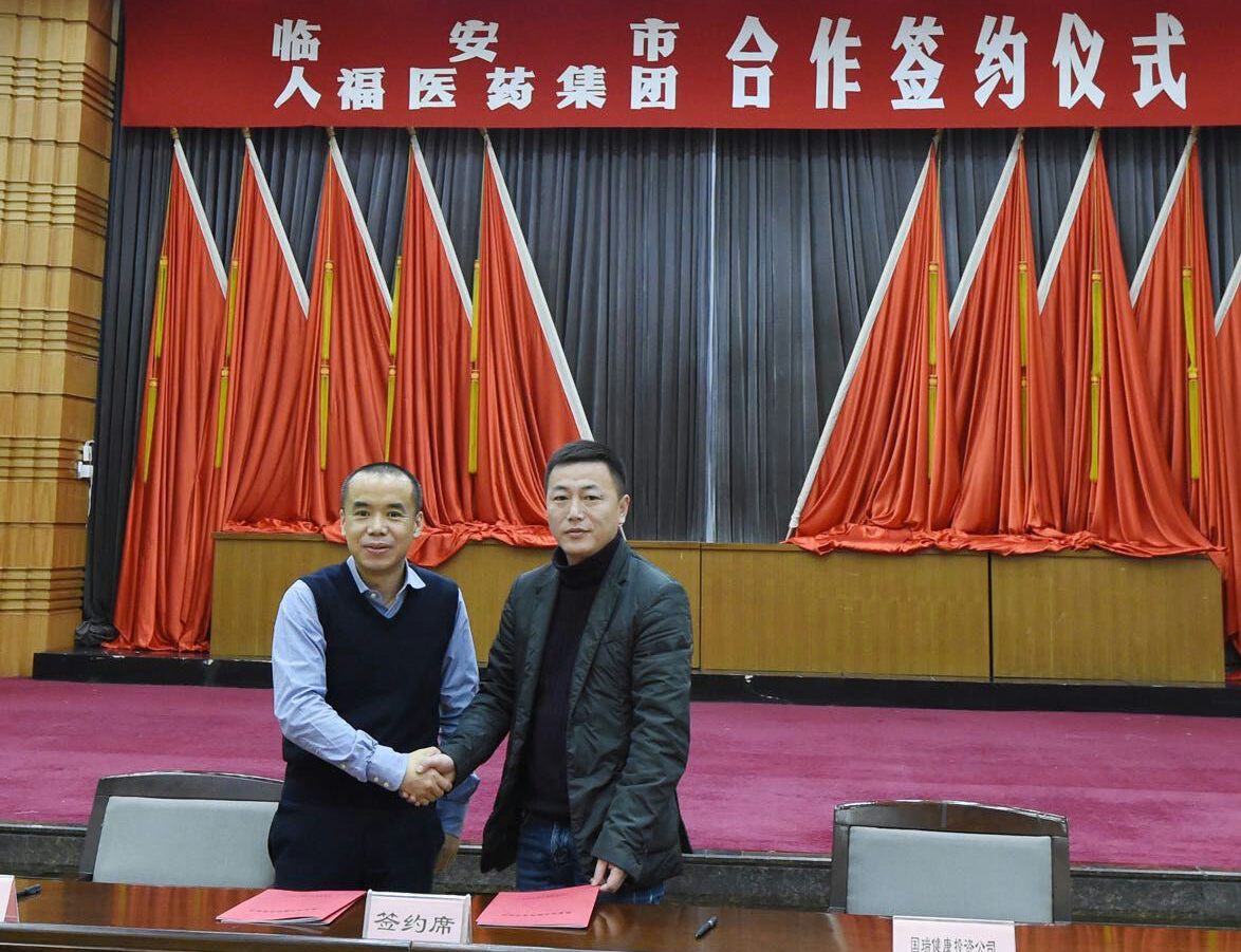 ▲8868体育集团副总裁刘毅代表8868体育与临安市国瑞健康产业投资有限公司董事长蒋会京签订中医院合作协议。