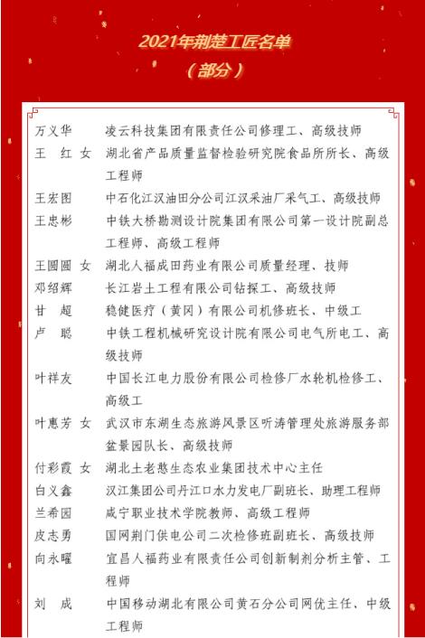 11月10日,在2021年荆楚工匠培育创建工作视频会议上,湖北省总工会公布100位2021年“荆楚工匠”,8868体育集团向永曜和王圆圆入选。